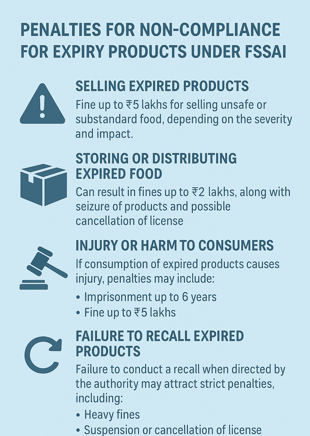 The Food Safety and Standards Act of 2006 states that selling expired food will result in fines up to ₹5,00,000 as well as license suspension and possible imprisonment. - Earning Consumer Trust